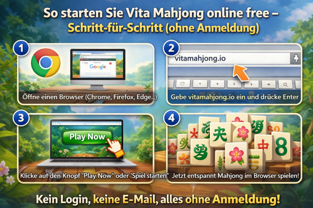 Vita Mahjong online free starten ist wirklich kinderleicht. Du brauchst nur einen Browser und Internet – fertig. Hier die einfache Anleitung: